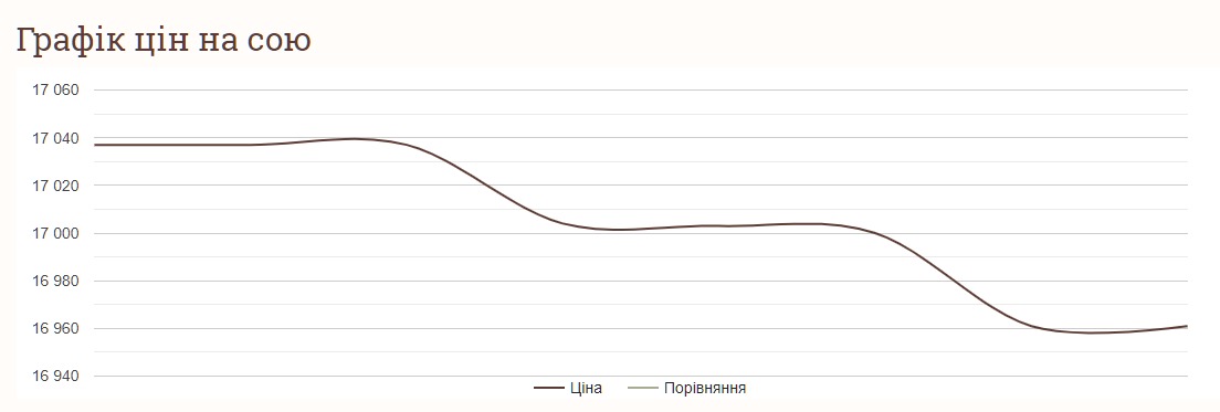 Ціни на сою за останні дні знизились майже на 100 гривень. У понеділок, 5 лютого, та у вівторок, 6 лютого, тонна сої коштувала 17 037 гривень. У середу, 7 лютого, ціна сої становила 17 004 грн за тонну, а у четвер, 8 лютого, знизилася до 17 003 грн. У п'ятницю, 9 лютого, тонна сої вже коштувала 17 000 грн за тонну. На вихідних — у суботу, 10 лютого, та у неділю, 11 лютого, вартість сої становила 16 961 гривень за тонну. Така ціна на цю зернову культуру тримається і нині.