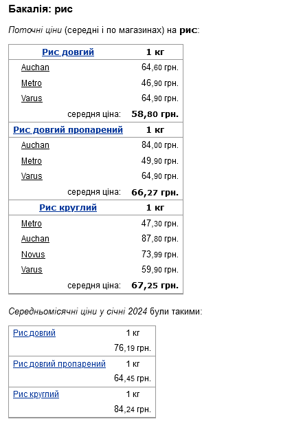 Довгий пропарений рис дещо додав у вартості — у січні коштував 64,45 грн/кг, а в лютому — 66,27 грн/кг. Проте у Metro крупу можна придбати за 49,90 грн/кг.
